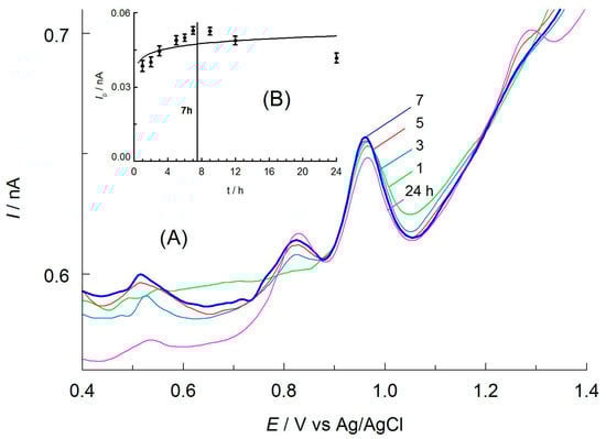 Preliminary investigations showed that acetonitrile was the most effective solvent for the extraction of apocynin from real samples among the extractants tested (methanol, ethanol, acetonitrile, and hot water). The curves recorded in the solutions containing AN extract were well shaped, symmetrical, and reproducible. The study’s subsequent stage was to establish the optimal time of the extraction process, allowing complete separation of the analyte from the plant matrix. For this purpose, a known amount of apocynin (5 mg) was added to a sample of the Kutki dietary supplement (1 g) and 10 mL acetonitrile. They were then mechanically shaken. After that, an appropriate volume of the filtered extract (100 μL) was diluted in a 25 mL volumetric flask with an experimentally chosen medium. DPV curves were recorded in solutions containing extracts taken after 1 to 24 h. A gradual increase in the peak current was observed, caused by an increase in apocynin concentration in the extracts over time (Figure 8). This increase was greatest for extraction times of up to 7 h. After this time, the peak current gradually stabilized. This means that the concentration of APO in the extract reached the maximum as a result of its content in the sample. It was concluded, based on the results obtained, that the optimal extraction time for apocynin from plant materials should not be less than 7 h.