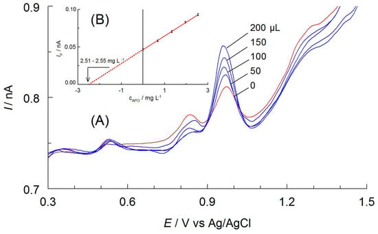 The first stage of analytical investigation was to construct a calibration curve and determine analytical parameters. For this purpose, DPV curves were recorded for the different APO concentrations under optimized environmental conditions and using optimal DPV parameters (Figure 6A). The selected analytical signal was the peak at a potential of 0.925 V. It was observed that this peak current increased linearly with increasing apocynin concentration in solutions in the range of 2.7 × 10−6–2.6 × 10−4 mol L−1 (Figure 6B). The calibration curve was described by the equation: Ip (nA) = (4.068 ± 0.0316) × c (mmol L−1) + (0.00089 ± 0.0011) with correlation coefficient, r = 0.9999. The limit of detection (LOD) of APO was calculated from the standard deviation of the intercept, Sb and the slope of the calibration curve, a (LOD = 3.3Sb/a [,]), and was determined at 8.9 × 10−7 mol L−1. The limit of quantification (LOQ = 3LOD) was estimated at 2.7 × 10−6 mol L−1.