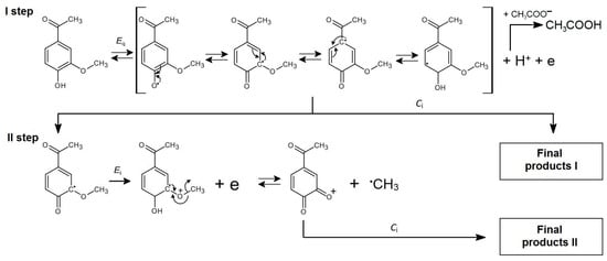 Based on the study results, a predicted two-step mechanism for the anodic oxidation of APO was proposed (Scheme 1). The APO radical is the product of the first step of the electrode reaction, which involves a quasireversible (Eq) and diffusion-controlled exchange of one electron and one proton. The presence of acetate anions in the solutions facilitate the process by binding protons and shifting the equilibrium toward the products. Consequently, a decrease in the potentials of the APO oxidation is observed (Figure 4). Both the APO radical and the APO cation (the product of the irreversible exchange reaction of one electron in the second step (Ei)), are unstable and undergo subsequent irreversible chemical reactions (Ci). It is also likely that, in the second step of electron exchange, an unstable methyl radical may be formed instead of the APO cation. The final products I and II of the anodic oxidation of apocynin are not reduced within the available potential range. The absence of reduction peaks on the CV curves (Figure 5) demonstrates this. The proposed mechanism of anodic oxidation of APO can therefore be described as EqCiEiCi. It is worth emphasizing that the presented mechanism is only probable. Our laboratory was unable to identify the primary and final products formed during the anodic oxidation of apocynin.