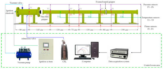 As shown in Figure 1, the experimental system consists of six main parts in turn: the gas distribution system, ignition system, explosion chamber, explosion diffusion line, material gripper, and data acquisition system [41]. The end of the explosion chamber and the diffusion line are equipped with a PTFE film with a thickness of 0.3 mm and a breaking pressure of 90 kPa, and the edge of the gripper is sealed by a rubber ring, which is used to ensure the hermeticity inside the chamber. The main equipment of the gas distribution system is a vacuum pump. Under normal temperature and pressure conditions, the vacuum pump extracts part of the air from the explosion chamber to form a relative negative pressure state in the chamber. The required combustible gas is filled into the explosion chamber in this state. According to the experimental requirements, a certain volume of pure methane gas is charged to make it a mixed gas with an explosion concentration of 9.5%. An electric spark generator with an ignition voltage of 220 V and an ignition energy of 440 J is installed at the front end of the explosion chamber. The ignition electrode is responsible for remote charging and ignition by the terminal ignition system. The back end of the explosion chamber is sealed by a circular steel plate with a diameter of 300 mm and a thickness of 40 mm, and there is a hole of 118 mm in the center of the circular steel plate to connect with the diffusion line at the back end. The inner diameter of the diffusion pipe is 118 mm. It is spliced together from three hollow steel pipes with a single pipe length of 2200 mm. The total length of the explosion diffusion pipe is 6600 mm.