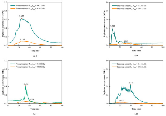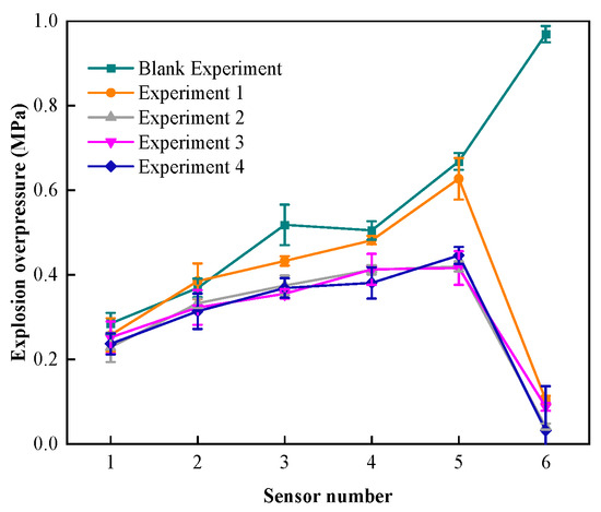 Figure 2 shows the explosion overpressure–distance data before and after different experiments. The maximum explosion overpressure of experiments 1 to 4 is reduced to 0.105 MPa, 0.067 MPa, 0.069 MPa, and 0.034 MPa, respectively, after passing through the explosion-proof material. The sensor value is significantly reduced after the explosion-proof material, and it can be clearly seen from the experimental data that experiments 2 to 4 have a better pressure drop effect under the same gas explosion overpressure propagation conditions [41] and are better than the single foam metal structure explosion-proof material.