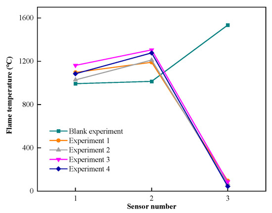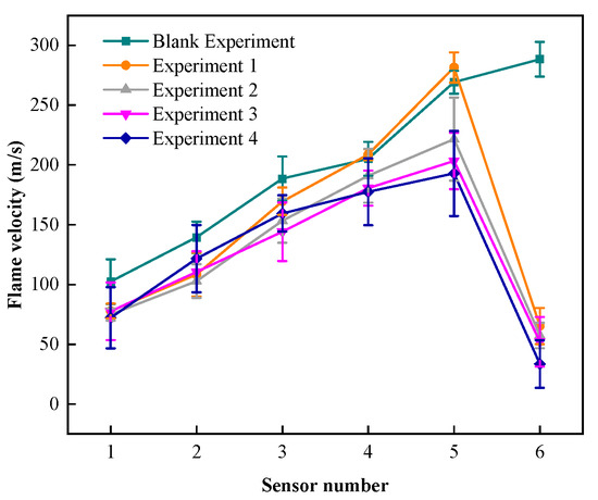 The relationship between flame propagation speed and propagation distance is shown in Figure 4. In experiments 1 to 4, the speeds detected by the sensors at the rear of the explosion-proof material are 65.28 m/s, 57.32 m/s, 52.18 m/s, and 33.48 m/s, respectively. After calculation, the flame propagation speed decreases by 216.27 m/s, 164.17 m/s, 151.09 m/s, and 160.30 m/s, respectively. The results show that adding a fiber material core layer to the foam iron–nickel panel can absorb and suppress the further propagation of the flame, thereby achieving the purpose of improving the explosion-proof effect. The reason for this is that when the flame passes through the fibers inside the foam metal, a “channel” that is smaller and denser than the original foam metal is formed. When the flame flows in the denser “channel,” the oxygen supply of the flame is further blocked, achieving the purpose of more easily isolating the flame propagation [41,42]. Similar to the experimental results of explosion overpressure suppression, glass fiber core layer material has the best flame propagation suppression effect.