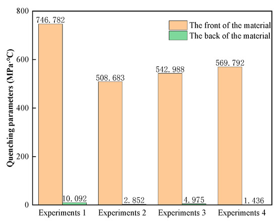 Figure 8 shows the comparison of the extinction parameters of different explosion-proof surfaces. The extinction parameter at the rear of the explosion-proof material in experiment 4 is 1.53 MPa·°C, and the explosion-proof effect is the best. The extinction parameters at the rear of the explosion-proof materials in experiments 1 to 3 are 10.09 MPa·°C, 4.66 MPa·°C, and 7.63 MPa·°C, respectively. The values of the extinction parameters before and after the materials are 755.75 MPa·°C, 546.41 MPa·°C, 564.07 MPa·°C, and 542.72 MPa·°C, respectively. When the extinction parameter is lower than 390 MPa·°C, people and equipment are within the relative safety limit, and the lower the extinction parameter, the better the protection effect. Data analysis shows that experiment 1 has a larger extinction parameter drop because the explosion-proof material has a larger initial explosion overpressure value at the front end, which leads to an increase in the extinction parameter. The extinction parameter values at the rear of the materials in experiments 2 to 4 are lower than in experiment 1, indicating that this core layer design can more effectively reduce the damage to the protected target caused by explosion shock, flame, and temperature.