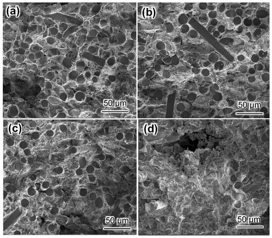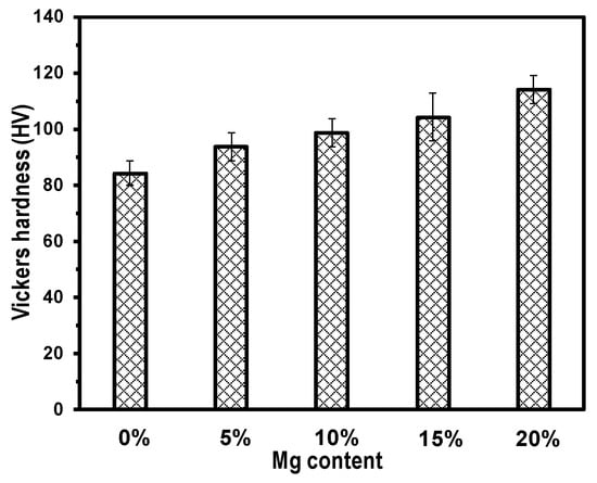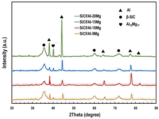 - The Vickers hardness of the composites increases with increasing Mg content, and the highest value is 114.06 HV for SiCf/Al-20Mg, which is 35.56% higher than that of SiCf/Al. The enhanced hardness relates to the strengthening effect caused by the introduction of Mg.