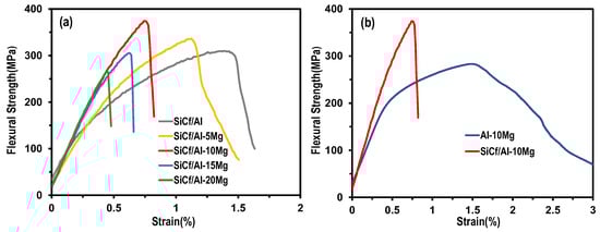 - SiCf/Al-10Mg has the best flexural strength and elastic modulus, 372 MPa and 161.7 GPa, but the fracture elongation of the composites decreases with the increase in Mg content. This could be attributed to the strengthened interfacial bonding by the introduction of the Mg element.