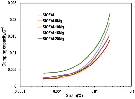 - The damping capacity of SiCf/Al-Mg shows a weak dependence on the strain when the strain amplitude is lower than 0.001%. And then the damping capacity increases dramatically with an increase in the strain (higher than 0.001%), which is better than the alloys with similar composition, demonstrating that the SiC fiber has a positive effect on improving the damping capacity of the composite.