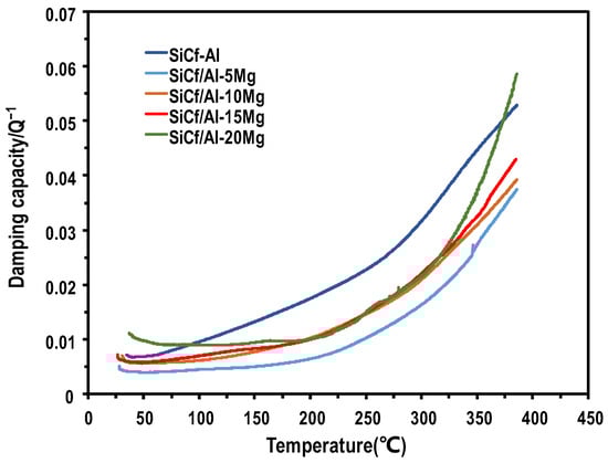 - The temperature-dependent damping capacity of the SiCf/Al-Mg composites reveals that all composites exhibited a tendency towards monotonic increase with testing temperature. Such an increase is more obvious at temperatures beyond 200 °C. This is attributed to the second phase, which forms more strong pinning points and increases the dislocation energy needed to break away from new pinning points.