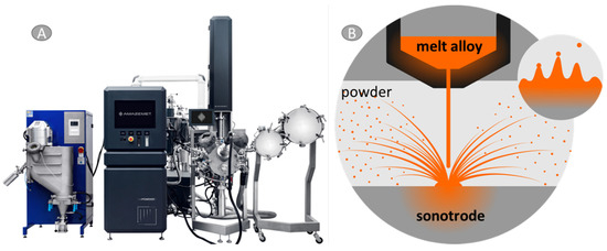 For the needs of this work, mixtures composed of custom-made AZ31 powder with Ti6Al4V addition (Ti6Al4V Grade 5, TLS Technik GmbH, Bitterfeld, Germany) were prepared. AZ31 in the form of rods was atomized by ultrasonic atomization with rePowder device, AMAZEMET Sp. z o. o, Warsaw, Poland (Figure 1A). Atomization was carried out with induction melting in a graphite crucible at 950 °C. After the melting step material had been released onto a refractory sonotrode plate, the pouring rate was controlled by a differential pressure of ~0.15 mbar between the induction furnace and atomization chamber plate vibrating at the frequency of 40 kHz, where the atomization took place (Figure 1B). The relative amplitude of vibrations was set at 75% during the processes. Atomization took place in the vacuum chamber with Ar gas overpressure. The oxygen level during the atomization was kept below 50 ppm.
