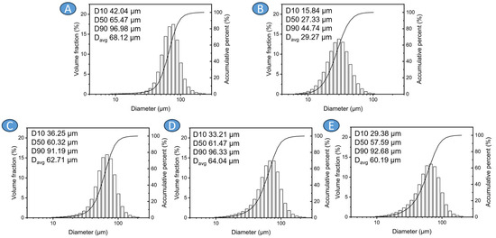 Particle size distributions shown together with d10, d50, d90, and average particles size for precursors and powder mixtures: (A) AZ31, (B) Ti6Al4V, (C) AZ31 + 10 vol.% Ti6Al4V, (D) AZ31 + 20 vol.% Ti6Al4V, (E) AZ31 + 30 vol.% Ti6Al4V.