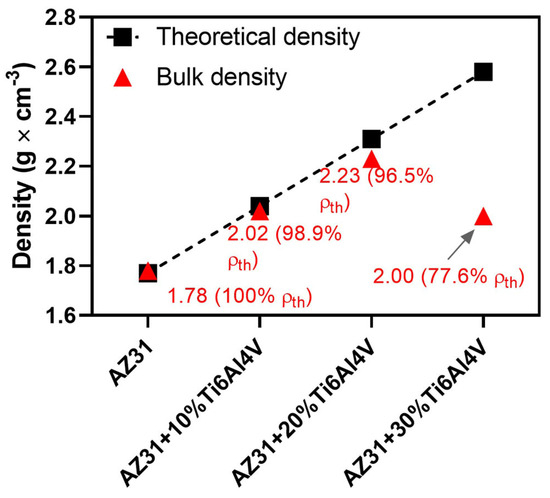 The densities of the fabricated pure AZ31 alloy and AZ31-based composites are presented in Figure 4. After the consolidation at 400 °C for 5 min, the reference material was characterized by full densification. As the amount of reinforcement increases, one can observe that the densification starts to drop. For AZ31-Ti6Al4V composites, we achieved a visible drop in densification: 98.9, 96.5, and 77.6% for 10, 20, and 30 vol.% of Ti6Al4V, respectively.