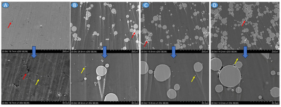 SEM-BSE images of the (A) AZ31, (B) AZ31 + 10 vol.% Ti6Al4V, (C) AZ31 + 20 vol.% Ti6Al4V, and (D) AZ31 + 30 vol.% Ti6Al4V; red arrows show voids, yellow arrow—small precipitations.