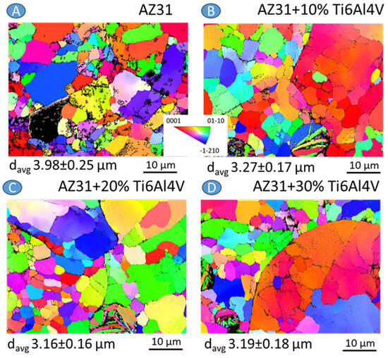 EBSD results in the form of inverse pole figure (IPF) maps presented for the investigated materials: (A) AZ31, (B) AZ31 + 10 vol.% Ti6Al4V, (C) AZ31 + 20 vol.% Ti6Al4V, and (D) AZ31 + 30 vol.% Ti6Al4V.
