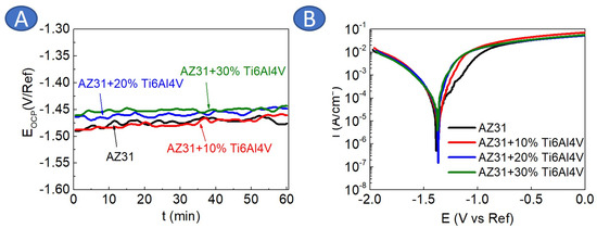 Results obtained from the electrochemical testing in 0.1 M NaCl for AZ31 and AZ31 with Ti6Al4V addition: (A) open circuit potential evaluation, (B) potentiodynamic curves.