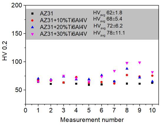 Microhardness of the investigated materials was determined to provide insight into the effect of Ti6Al4V particle addition on the hardness of the AZ31 matrix (Figure 11). As observed, the microhardness of the matrix increased together with the Ti6Al4V addition, and the average values were found to be around 62 ± 1.8, 68 ± 5.4, 72 ± 6.2, and 78 ± 11.1 HV0.2 for AZ31, AZ31 + 10 vol.% Ti6Al4V, AZ31 + 20 vol.% Ti6Al4V, and AZ31+ vol. 30% Ti6Al4V, respectively. Ti6Al4V addition increased microhardness; however, an increase in standard deviation is significant. This may be related to dispersion inhomogeneities of the reinforcing phase, which is a common occurrence in MMC. We observed agglomeration of the reinforcement at the highest concentration of the particles (Figure 5), which confirms our hypothesis.