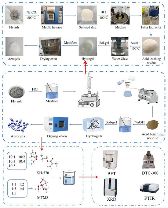 Considering the high-silica (SiO2) content in fly ash, it can be used as a raw material for the preparation of silica aerogel. The utilization of fly ash through methods such as acid dissolution, alkali leaching, sol–gel processing, surface modification, and atmospheric drying can effectively reduce the production cost of preparing silica aerogels from fly ash, while also offering new avenues for the utilization of fly ash [15,33,34,35,36]. Consequently, the utilization of fly ash and the preparation of silica aerogel using fly ash as a raw material have the potential to reduce costs, increase value-added utilization, and have significant ecological and socio-economic benefits. However, further research is required to optimize the preparation methods and achieve aerogel with desired properties.