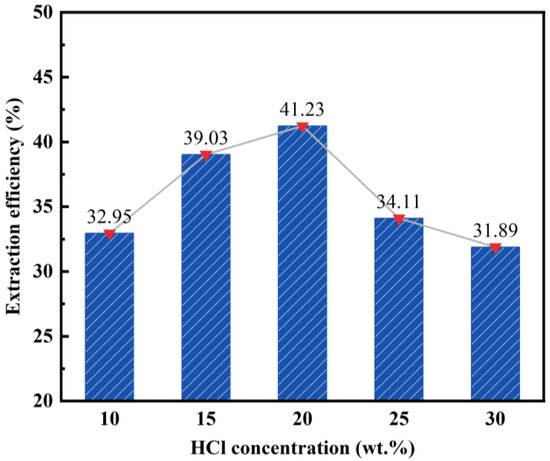 By maintaining a constant solid–liquid ratio (1:4), reaction temperature (100 °C), and reaction time (2 h), we can investigate the impact of varying hydrochloric acid concentrations on the desilication rate of fly ash. Figure 2 illustrates the obtained results.