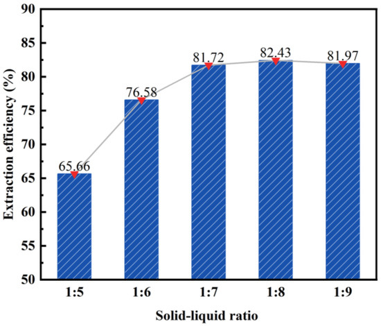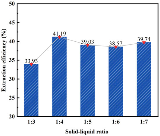 During the acid leaching experiment, the reaction unexpectedly ceased as a result of fly ash agglomeration. Further investigation, as indicated by a previous study, revealed that the incomplete reaction was due to an excessively low solid–liquid ratio of fly ash to hydrochloric acid [33]. To address this issue, the experimental conditions were maintained at a constant (Ceteris paribus), and the influence of different solid–liquid ratios on the desilication rate of fly ash was investigated. The results of this study can be observed in Figure 6.