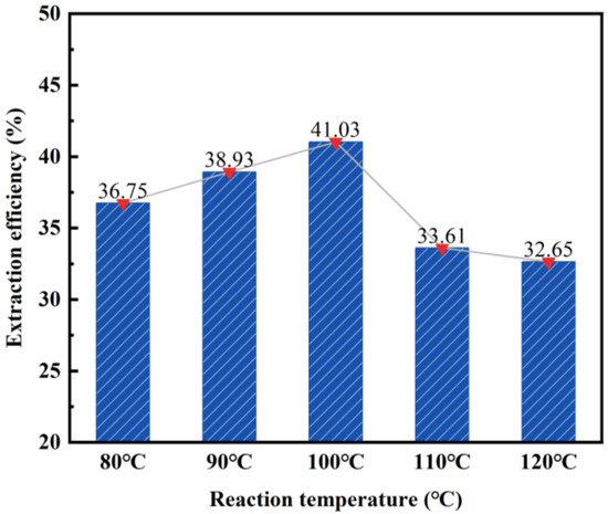 According to the findings presented in Figure 4, the desilication rate of fly ash initially increases and then decreases as the reaction temperature increases. A turning point is observed at 100 °C, with the highest desilication rate reaching 41.03%. However, the desilication rate is found to be the lowest at 120 °C, measuring 32.65%. The primary reason for this is that the boiling point of 20 wt% hydrochloric acid is 110 °C. When the temperature exceeds 110 °C, the solution reaches its boiling point and undergoes rapid evaporation, thereby affecting the acid-leaching effect of fly ash. Consequently, a reaction temperature of 100 °C was chosen as the subsequent reaction condition.