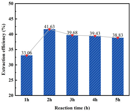 According to the data presented in Figure 5, the desilication rate of fly ash initially increases and then stabilizes as the reaction time increases. At a reaction time of 1 h, the desilication rate reaches its lowest point at 33.06%. This can be attributed to the short reaction time, which hinders the complete reaction between the fly ash and hydrochloric acid. Conversely, at a reaction time of 2 h, the highest desilication rate is observed at 41.19%, indicating that the acid leaching reaction is completed at this point. When the reaction time is extended to 5 h, there is no significant change in the desilication rate. Consequently, a reaction time of 2 h was chosen as the subsequent reaction condition.
