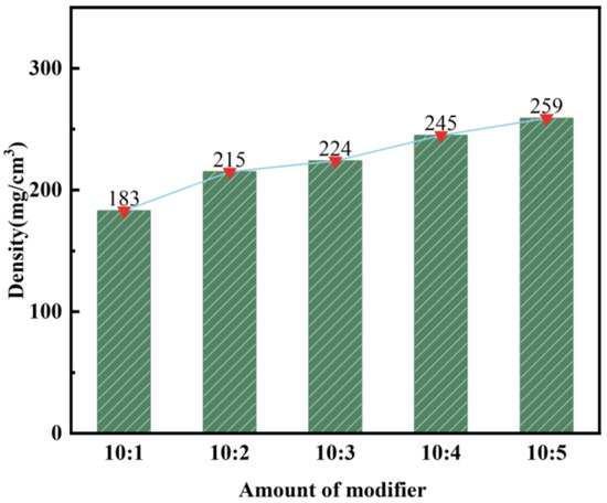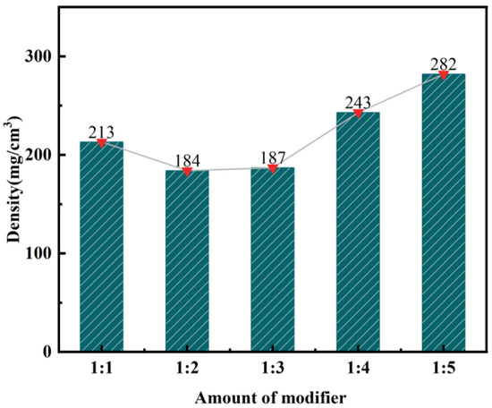 This section focuses on analyzing the process of producing modified silica aerogel from calcined, activated fly ash. The objective is to investigate the impact of different modifiers on the density of the aerogel. The ratio of the modified solution can be found in Table 5, while the corresponding experimental results are illustrated in Figure 7 and Figure 8.