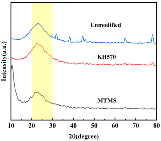 In order to investigate the impact of various strengthening modifiers on the crystal structure of silica aerogel, X-ray diffraction (XRD) analysis was performed on the KH-570, MTMS-modified, and unmodified silica aerogel. The results of this analysis are depicted in Figure 10.