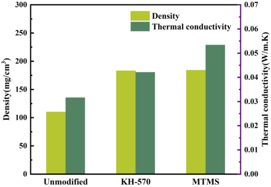 As depicted in Figure 11, both the density and thermal conductivity of the unmodified silica aerogel are low, measuring 110 mg·cm−3 and 0.0316 W·(m·K)−1, respectively. However, when enhanced with KH-570, the density and thermal conductivity of the silica aerogel increase significantly to 183 mg·cm−3 and 0.0421 W·(m·K)−1, respectively. While the density of the MTMS-enhanced silica aerogel is not considerably different from the KH-570-enhanced version, there is an improvement in the thermal conductivity. The density of the silica aerogel modified with MTMS is measured at 184 mg·cm−3, while its thermal conductivity is 0.0534 W·(m·K)−1.