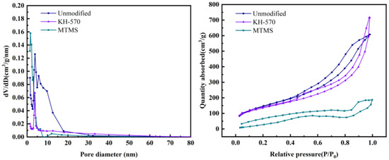 As depicted in Figure 14, the adsorption–desorption isotherm curves of the unmodified, MTMS-modified, and KH-570-modified silica aerogel samples all exhibit Type IV behavior, indicating that the prepared silica aerogel is a mesoporous material. The unmodified and KH-570-modified silica aerogels show an H3-type hysteresis loop in the middle- and high-pressure range, suggesting the presence of a slit-like mesoporous structure. On the other hand, the MTMS-modified silica aerogel displays an H2 (b)-type hysteresis loop in the middle- and high-pressure range, indicating a relatively wider pore size distribution and potential channel blockage [37].