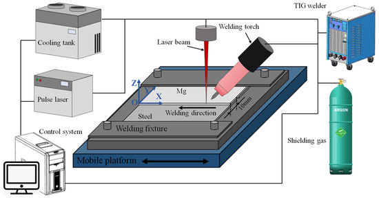 The welding equipment was a hybrid system consisting of a Nd: YAG (Neodymium-doped Yttrium Aluminium Garnet; Nd: Y3Al5O12, Guangzhou Ruitong Laser Technology Co., Ltd., Guangzhou, China) pulsed solid-state laser with a maximum power of 1 kW and a GTAW machine (OTC AVP-500, OTC Electromechanical Qingdao Co., Ltd., Qingdao, China) with a peak current of 500 A. The laser had an infrared wavelength of 1064 nm, a focal distance of 120 mm, and a minimum spot diameter of 0.6 mm, which was similar to other lasers used in industrial applications. The tungsten electrode of the arc was WC20 with a diameter of 2.4 mm. The sample to be welded was fixed on a movable platform, and the experimental setup is shown in Figure 1. The welding process utilized a 10 mm wide lap structure, with the upper layer consisting of Mg alloy and the lower layer being made of steel. The laser was directed perpendicularly onto the upper surface of the Mg alloy, while the TIG welding torch was angled at 45° to the laser beam in the X-O-Z plane. This paper innovatively adopted non-coaxial welding between the laser and arc heat source; that is, the distance between the laser beam and tungsten tip in the O-X direction was 1.5 mm, and the distance between the laser beam and tungsten tip in the O-Y direction was 1.0 mm. The optimized welding parameters are shown in Table 2.