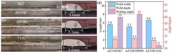 Three-dimensional macroscopic morphology and cross-sectional morphology of different joints: (a) AZ31B/SK7; (b) AZ31B/DP980; (c) AZ31B/316L; (d) weld width, weld depth, and wetting angle of the three joints.