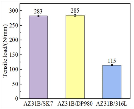 - The tensile loads for the AZ31B/SK7, AZ31B/DP980, and AZ31B/316L joints were measured as 283 N/mm, 285 N/mm, and 115 N/mm, respectively.
