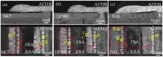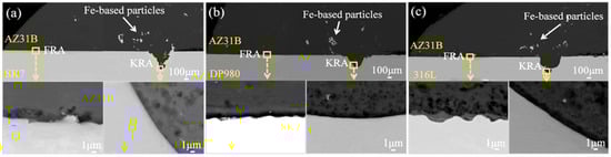 The interface microstructure of the joints: (a) AZ31B/SK7; (b) AZ31B/DP980; (c) AZ31B/316L.