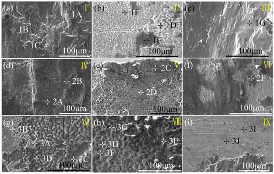 The locations in different areas marked by the yellow boxes in Figure 4 underwent microscopic magnification as presented in Figure 5 and quantitative point analysis results which are shown in Table 3, Table 4 and Table 5. I–IX in Figure 4 correspond to I–IX in Figure 5. Based on binary phase diagrams of Al-Mg, Al-Fe, and Al-Mn [24,25,26], Fe3Al IMCs were both formed at the KRA of AZ31B/SK7 and AZ31B/DP980, while Al11Mn4 IMCs were observed at the KRA of the AZ31B/DP980 with a higher Mn content. These findings have been previously reported [27,28] and further validated through micro XRD analysis conducted during this study. It was suggested that fracture along Mg/Fe may be related to the thickness of the interface layer. Different from the fracture morphology of the other two joints (Figure 5b,e), the fracture surface of the FRA of AZ31B/316L (Figure 5e) was smoother. Based on the quantitative point analysis results, it can be inferred that the brittle eutectic structure consisting of Mg17Al12 + (Mg) and Mg17Al12 IMCs (Table 5) may account for the low strength and brittle fracture behavior.