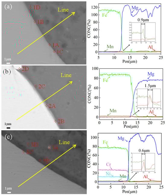 Line analysis of the Mg/Fe interface at the KRA: (a) AZ31B/SK7; (b) AZ31B/DP980; (c) AZ31B/316L.