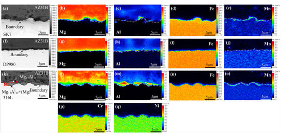 Mapping analysis of the Mg/Fe interface at the FRA: (a–e) AZ31B/SK7; (f–j) AZ31B/DP980; (k–q) AZ31B/316L.