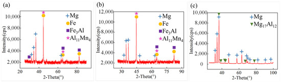 To confirm the phase composition of the interface layer, micro XRD analysis was conducted on the fracture surfaces of three joints. The corresponding results are presented in Figure 10. The fracture surfaces of AZ31B/SK7 and AZ31B/DP980 joints not only detected Fe and Mg, but also confirmed the presence of Fe3Al and A11Mn4, indicating that both joint fractures indeed generated the aforementioned Fe–Al and Al–Mn phases at the interface in addition to the residual Mg. Moreover, on the fracture surface of AZ31B/316L joint, significant amounts of Mg17Al12 compound were detected, indicating that these phases were indeed formed at the FRA during the welding process.
