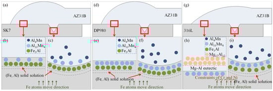 Diagram of interface bonding mechanism: (a–c) AZ31B/SK7; (d–f) AZ31B/DP980; (g–i) AZ31B/316L.