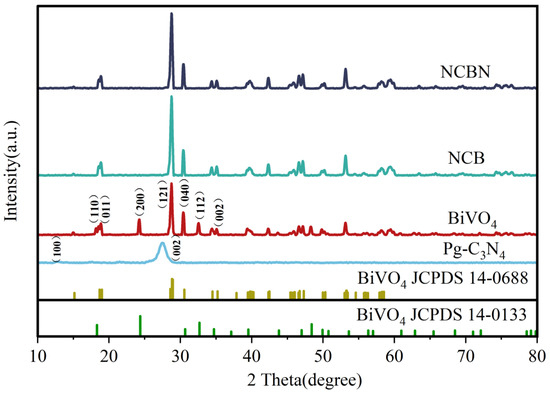 The crystal structure of the synthesized catalyst was analyzed by XRD (Figure 1). The characteristic peaks of BiVO4 were indexed to a mixed structure of monoclinic scheelite (JCPDS No. 14-0688) and tetragonal zircon (JCPDS No. 14-0133), indicating that the BiVO4 had been successfully prepared. The strong peak at 28.75° was consistent with the (121) crystal plane of monoclinic BiVO4 [34], which also suggested that monoclinic scheelite was the main structure of BiVO4. Meanwhile, the characteristic peaks of NCB and NCBN showed a monoclinic scheelite structure, which might be due to the coupling interaction between BiVO4 and biochar. For PCN, the small peak near 12.7° was consistent with the (100) crystal face, which was caused by the plane stacking of triple homogeneous triazine units. Also, the strong peak at 27.4° corresponded to the (002) crystal face of PCN, which originated from an interlayer aromatic structure [35]. In both NCB and NCBN, due to the disruption of the PCN structure, the intensity of the PCN peaks decreased significantly, indicating that the development of the composite photo-catalyst was different from that of the original PCN in the plane surface [36].