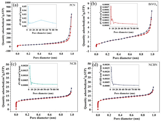 N2 adsorption–desorption isotherms and pore size distributions of (a) PCN, (b) BiVO4, (c) NCB, and (d) NCBN.