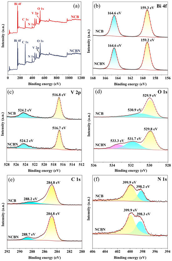 XPS was used to analyze and compare the elemental states and chemical composition of NCB and NCBN. As shown in Figure 4a, the prepared NCBN consisted of five elements (C, N, Bi, O, and V), which was consistent with the EDS spectra. Figure 4b–f shows the high-resolution spectra of the individual elements. As shown in Figure 4b, the Bi 4f of the NCB showed two strong peaks at 159.3 eV and 164.6 eV, corresponding to Bi 4f7/2 and Bi 4f5/2 for Bi3+ [38], respectively. However, the peak at 159.3 eV was negatively shifted to 159.2 eV in the NCBN. For V 2p (Figure 4c), the two peaks at 516.8 eV and 524.2 eV in NCB corresponded to V 2p1/2 and V 2p3/2, respectively, which could be attributed to V5+ spin-orbit splitting [39]. In the V 2p profile in NCBN, the peak at 516.8 eV was negatively shifted to 516.7 eV. For the O 1s spectrum (Figure 4d), the peak at 529.9 eV in the NCB was attributed to the oxygen atom in the V-O bond. In the NCBN material, this peak moved to 529.8 eV. Another O 1s peak at 531.76 eV and 533.3 eV in the NCB might originate from chemisorbed oxygen species and hydroxyl groups, respectively [40]. For the C 1s in NCB (Figure 4e), the two peaks at 284.8 eV and 288.2 eV were attributed to the C=C bond and -C=O [41]. In the NCBN spectrum, 288.2 eV was positively shifted to 288.7 eV. In Figure 4f, the NCB shows two peaks at 398.2 eV and 399.9 eV, which were attributed to pyridine nitrogen and pyrrole nitrogen, respectively [42]. Similarly, the peak at 398.2 eV was positively shifted to 399.3 eV in the NCBN.