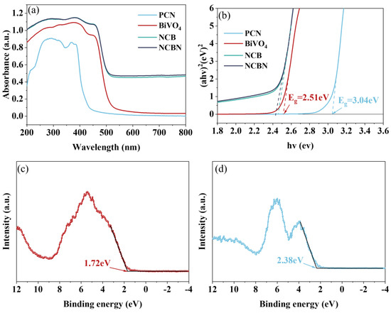 The optical properties and band gap depletion (Eg) of materials were characterized by UV DRS. As shown in Figure 5a, the absorption edge of PCN was about 420 nm, and the absorption limit of BiVO4 was about 510 nm. It was noteworthy that the absorbed light range of both NCB and NCBN was shifted towards the visible range compared to PCN and BiVO4. Moreover, the NCBN showed the widest absorbed light range and the strongest absorbance. The reason for this phenomenon was that the heterojunction altered the optical properties of the material. The Eg of all samples was calculated by the Tauc equation (Equation (1)). In Figure 5b, the Eg of BiVO4 and PCN are shown as 2.51 eV and 3.04 eV, respectively. However, the Eg of NCBN was relatively low, which was conducive to its visible light response. In addition, the VB-XPS spectra (Figure 5c,d) were used to determine the valence band (VB) positions of BiVO4 and PCN, which were 1.72 eV and 2.38 eV, respectively. According to Equation (2), the conduction band (CB) position of BiVO4 and PCN was −0.79 eV and −0.66 eV, respectively.