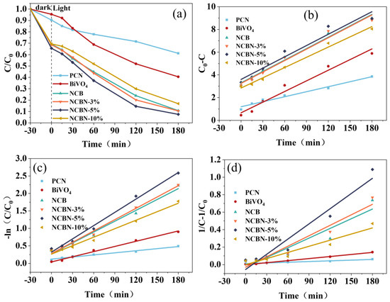 The degradation rate of NOR was analyzed by the 0, 1, and 2 order kinetic equations. As shown in Figure 6b–d and Table 2, the R2 values of the 1-order correlation coefficients for the six samples (PCN, BiVO4, NCB, NCBN-3%, NCBN-5%, and NCBN-10%) were 0.9816, 0.9938, 0.9873, 0.9918, 0.9921, and 0.9846, respectively. These values were higher than those in the 0-order and 2-order kinetic equations, which indicated that the degradation of NOR conformed to the 1-order kinetic equation. In addition, the kinetic constants k for the six samples (PCN, BiVO4, NCB, NCBN-3%, NCBN-5%, and NCBN-10%) were 0.0020, 0.0050, 0.010, 0.011, 0.013, and 0.0080 min−1, respectively. The degradation rate constant of NCBN-5% was higher than that of other materials, which further proved that NCBN-5% had higher degradation efficiency.