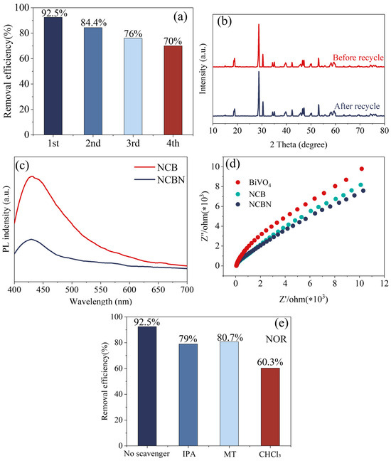 (a) Recycling times on the photocatalytic activity, (b) XRD pattern of the material before and after cycling, (c) PL spectra, (d) EIS Nyquist plots of the electrochemical impedance spectra curves, and (e) the quenching experiment of NCBN catalysts.