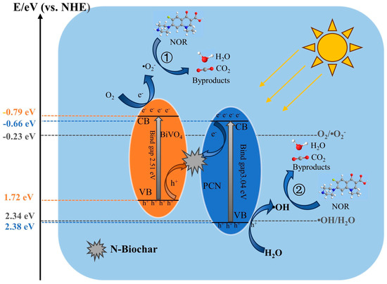 The mechanism of NCBN degradation of NOR was proposed. As shown in Figure 9, a carrier complex center was established between BiVO4 and PCN due to the presence of N-Biochar. For N-Biochar, due to the similar size of nitrogen and carbon atoms, the nitrogen atoms replacing carbon atoms caused little damage to the skeleton structure of carbon materials, which could maintain the stability of carbon materials [51]. Meanwhile, the nitrogen atoms were more electronegative than carbon atoms, with the result that the doped carbon material had superior electronic conductivity [52]. This phenomenon promoted the flow of photogenerated electrons in the CB of PCN into the N-Biochar conductor. Then, to maintain the charge balance, the holes generated in the VB of BiVO4 rapidly migrated into N-Biochar, where they recombined with electrons. As a result, the holes were mainly clustered in the VB of PCN and the electrons were mainly concentrated in the CB of BiVO4, which facilitated the separation of charge carriers.