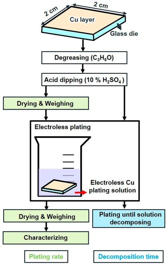 For this study, a glass substrate with a thickness of 0.5 mm was used, and a 30 nm Cr adhesion layer and a 200 nm Cu seed layer were consecutively sputtered onto it. The wafers were then sliced into individual dies measuring 2 cm × 2 cm. The pre-treatment processes are shown in Figure 1. First, the sample was degreased through ultrasonication for 1 min using acetone, and the copper (II) oxide was cleaned with 10% H2SO4 for 1 min. Two different approaches were employed to examine the plating rate and decomposition time of the plating solution. The plating rate was determined using the weight method described below:
