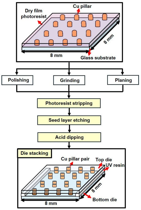 To prepare the dies for electroless plating, a pre-treatment process involving multiple steps was required. The first step involved the use of different methods to flatten the pillars and determine optimal results. These methods included sandpaper polishing, machine grinding (SpeedFam, BSG-VFT0436, Hsin Chu, Taiwan), and surface planar planning (Disco, DFS8910, Tokyo, Japan). The die was then soaked in a 10% sodium hydroxide solution to remove the photoresist layer. The Cu and Cr layers were selectively etched using sodium persulfate (SPS) and hydrochloric acid. To remove the copper oxide from the surface of the copper pillars, the die was immersed in 10% sulfuric acid. Next, a layer of UV resin was applied to one die, and another die with a matching pillar pattern was aligned on top using a flip-chip die bonder (Tresky, T-3002-FC2, Thalwil, Switzerland). After exposing the UV resin to UV light and hardening it, a test vehicle was established, and the electroless plating process began. A flow chart of the test vehicle fabrication process is shown in Figure 2. The pre-bonded pillar height in this study ranged from approximately 16–36 μm, depending on the flattening process. The gap between the pillars was approximately 1–6 μm.