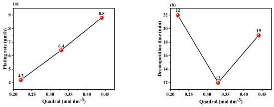Quadrol acted as a complexing agent, improving the plating rate and bath stability. The reaction between quadrol and Cu2+ facilitates the reduction of Cu, leading to a significant increase in the deposition rate (as shown in Equation (2)) [31]. Additionally, the formation of a cuprous complex prevents side reactions (as shown in Equations (3) and (4)) [32], which stabilizes the plating bath and extends the decomposition time. However, there is a slight deviation in the quadrol-to-decomposition time curves, indicating that other factors, such as bath composition, may have a minor impact on the complexing effects [27]. Figure 4a,b shows that the highest plating rate and optimum decomposition time were achieved at a concentration of 0.44 M quadrol.