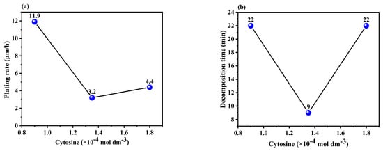 Cytosine served as both a stabilizer and an accelerating agent in the plating process. A stabilizer prevents the plating bath from decomposing, whereas an accelerating agent increases the deposition rate. Figure 5a shows that a small amount of cytosine significantly increased the plating rate, which is consistent with the findings of previous studies [16,18]. The acceleration of the plating rate with the inclusion of cytosine can be attributed to the existence of delocalized π-electron bonds in its structure, which promotes the plating process. This was because of the higher adsorption capacity of cytosine at low concentrations on the reactive copper surface, which facilitated the reduction of copper ions and accelerated the deposition rate. However, excessive copper surface coverage can decrease the deposition rate [16,33]. Figure 5b illustrates that the bath life can be effectively extended by adding a small amount of organic additives, as mentioned in the literature [16]. However, larger amounts of additives did not significantly affect the decomposition time and may have even decreased the plating rate. Therefore, the optimal concentration of cytosine is 9 × 10−5 M.