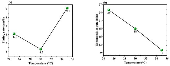 The exponential factor in the equation was responsible for the substantial increase in the plating rate, even with a slight temperature difference. The slight deviation in the relationship between temperature and plating rate can be attributed to the minor complexing effects due to other concentration variables. Moreover, an increase in the operating temperature accelerates the decomposition reactions described in Equations (3) and (4), leading to a significant reduction in decomposition time. Since the objective of this study is to effectively enhance the plating rate while ensuring that the decomposition time is sufficient for operation, the optimal operating temperature is determined to be 35 °C.