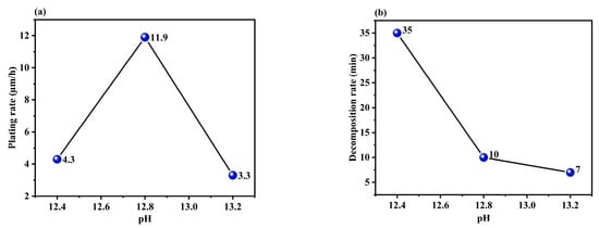 Figure 7a,b shows the plating rate and decomposition time plotted at various pH levels. The plating rate gradually increased with an increase in the pH of the solution. This is because higher hydroxide concentrations typically lead to an increase in the catalytic oxidation of HCHO, which in turn results in a higher plating rate, as described by Equation (2) [38]. However, a sudden decrease in the plating rate occurred beyond a certain pH, which is a phenomenon observed in other copper coatings [36]. This is because a high pH can cause the plating solution to decompose, thereby reducing the decomposition time, copper ion concentration, and plating rate. Finally, the experiments conducted in this study showed that a pH of 12.8 produced the optimum performance in terms of plating rate and decomposition time.