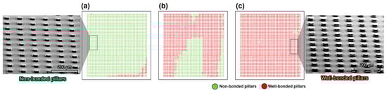 The optimized copper–quadrol complex solution was injected into the test vehicle and allowed to react at 35 °C for 7 min. To avoid solution decomposition, the reaction time was kept shorter than the decomposition time. After the completion of the reaction, the sample was dissolved in acetone, and the two dies were separated to observe the bonded pillars. Subsequently, we discuss the bonding outcomes with different copper pillar surface treatments, as illustrated in Figure 8. As shown in Figure 8a, only 3% of the Cu pillar pairs were bonded (red pillars) after polishing with sandpaper and electroless plating with copper–quadrol complex solution at 35 °C for 7 min. The rest were considered non-bonded pillars (green pillars), and the SEM image displayed their morphologies. The bonding percentage was low because some copper pillar pairs in the test vehicle had large gaps owing to the high average pillar height difference. Therefore, only pillar pairs with small gaps could be bonded, whereas the other pillar pairs with large gaps were left unbonded. Detailed information is provided in Table 6.
